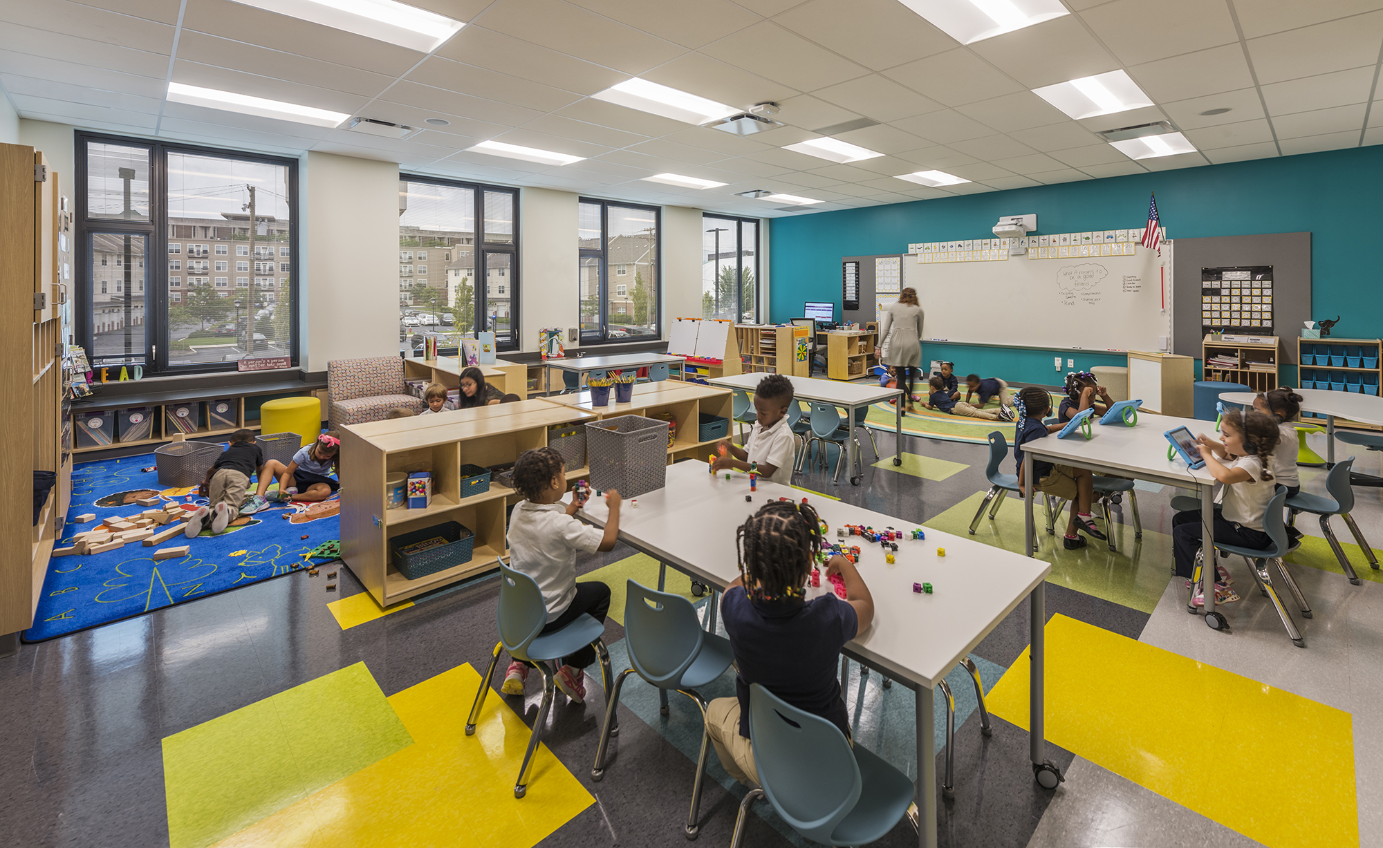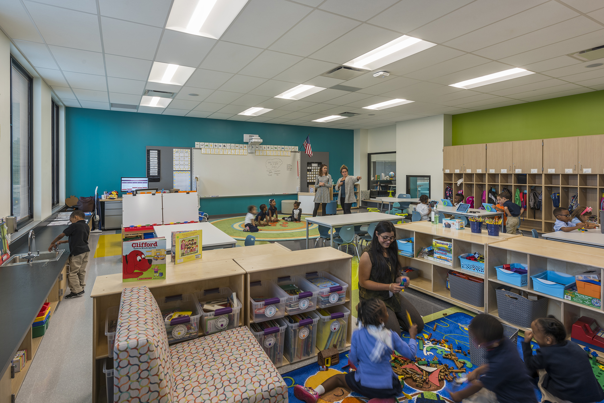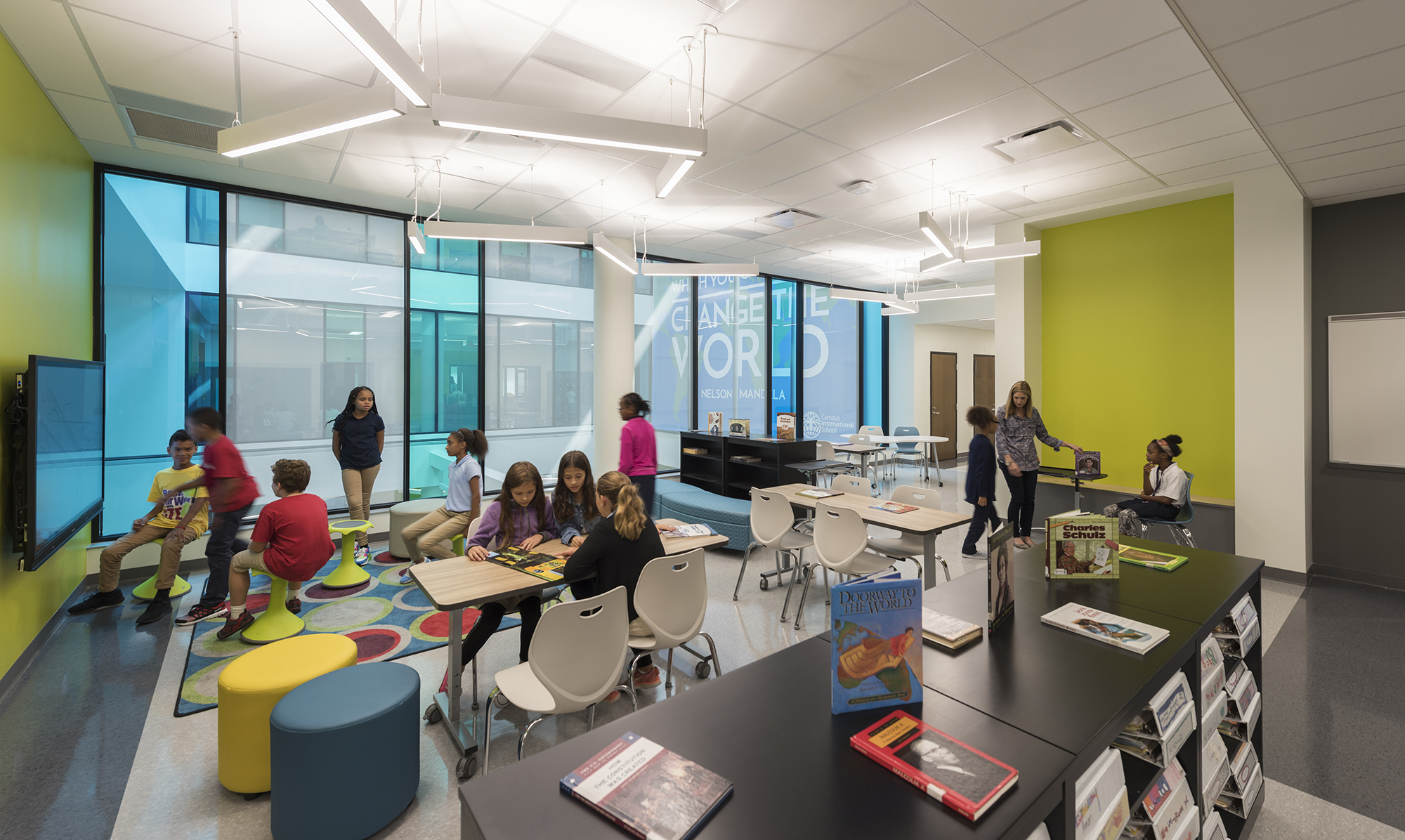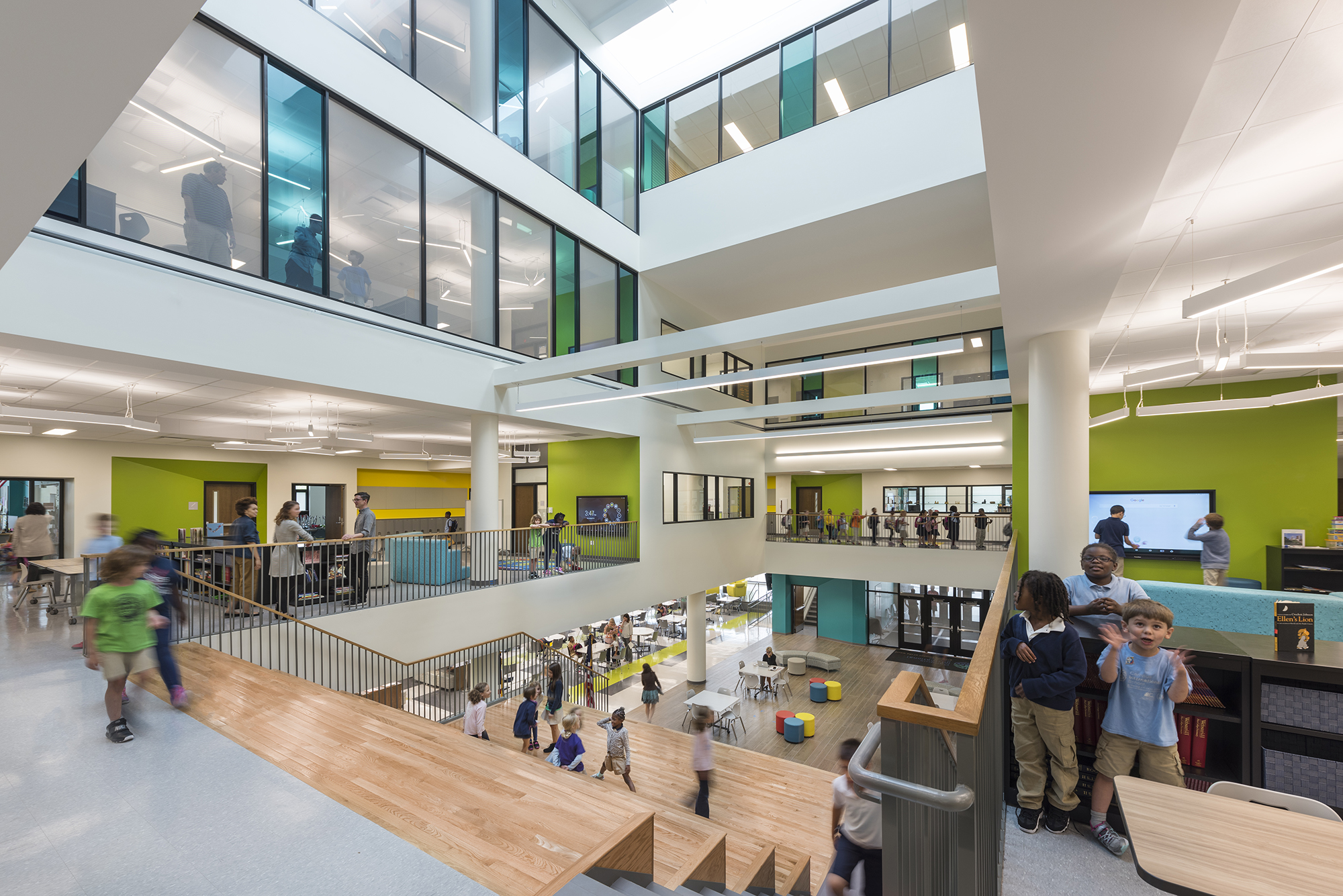 Students have access to a variety of flexible student-centered learning spaces. Collaborative project areas outside each classroom visually connect all four levels and add to the school’s bright, energizing atmosphere. Small group areas and distributed administration space on each classroom level enable flexible group sizes to work together in various settings. Flexible, technology-ready areas are distributed throughout the building and contain a variety of books and other resources to give students ease of access so they can self-direct or seek support as needed.