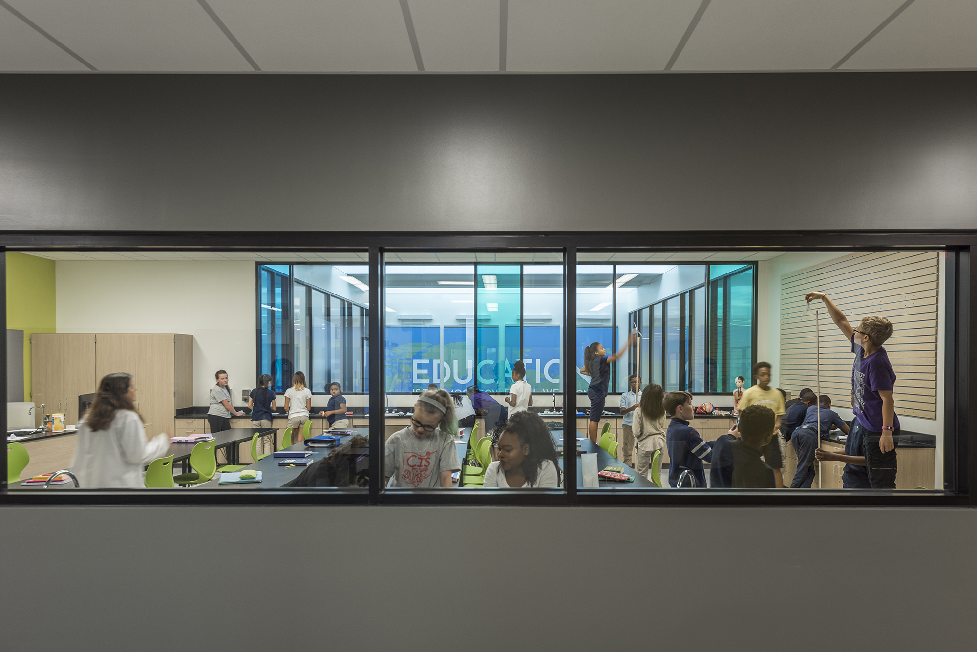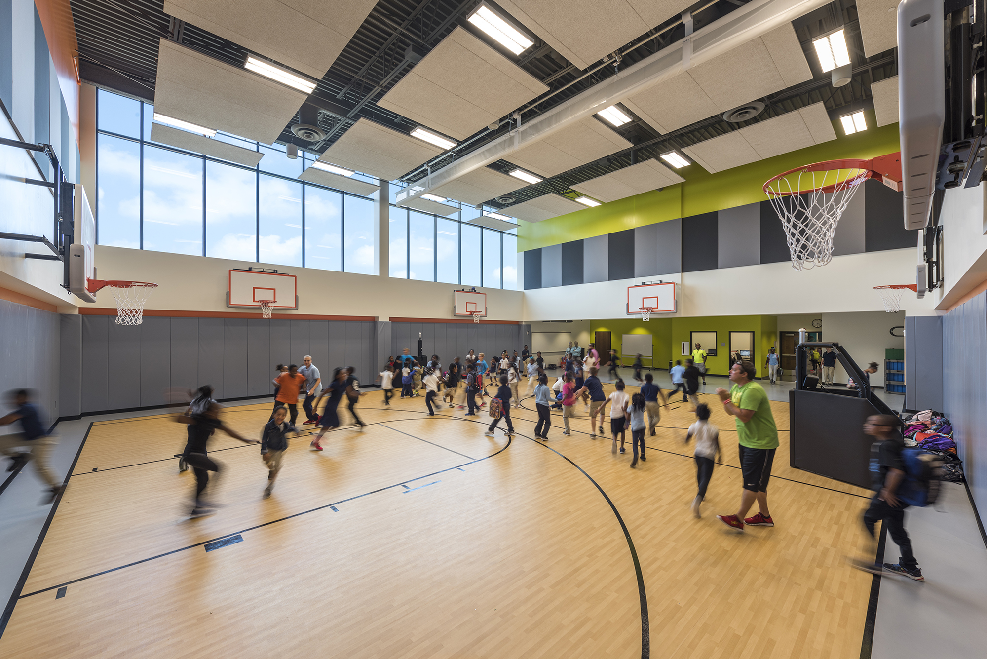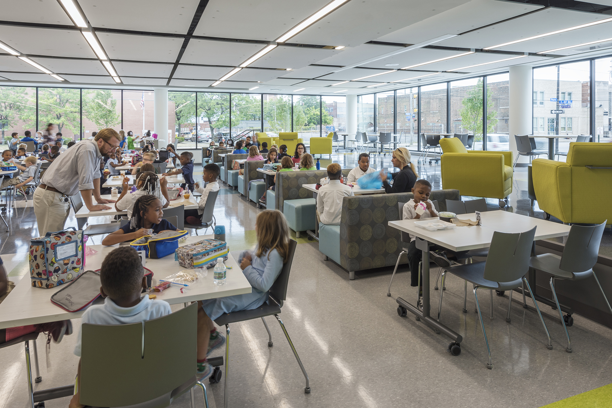 The abundant open spaces and natural light encourage daily movement and improve student wellness and focus. Large windows that brighten the interior enhance sustainability goals by capturing and maximizing daylight and significantly decreasing energy use.