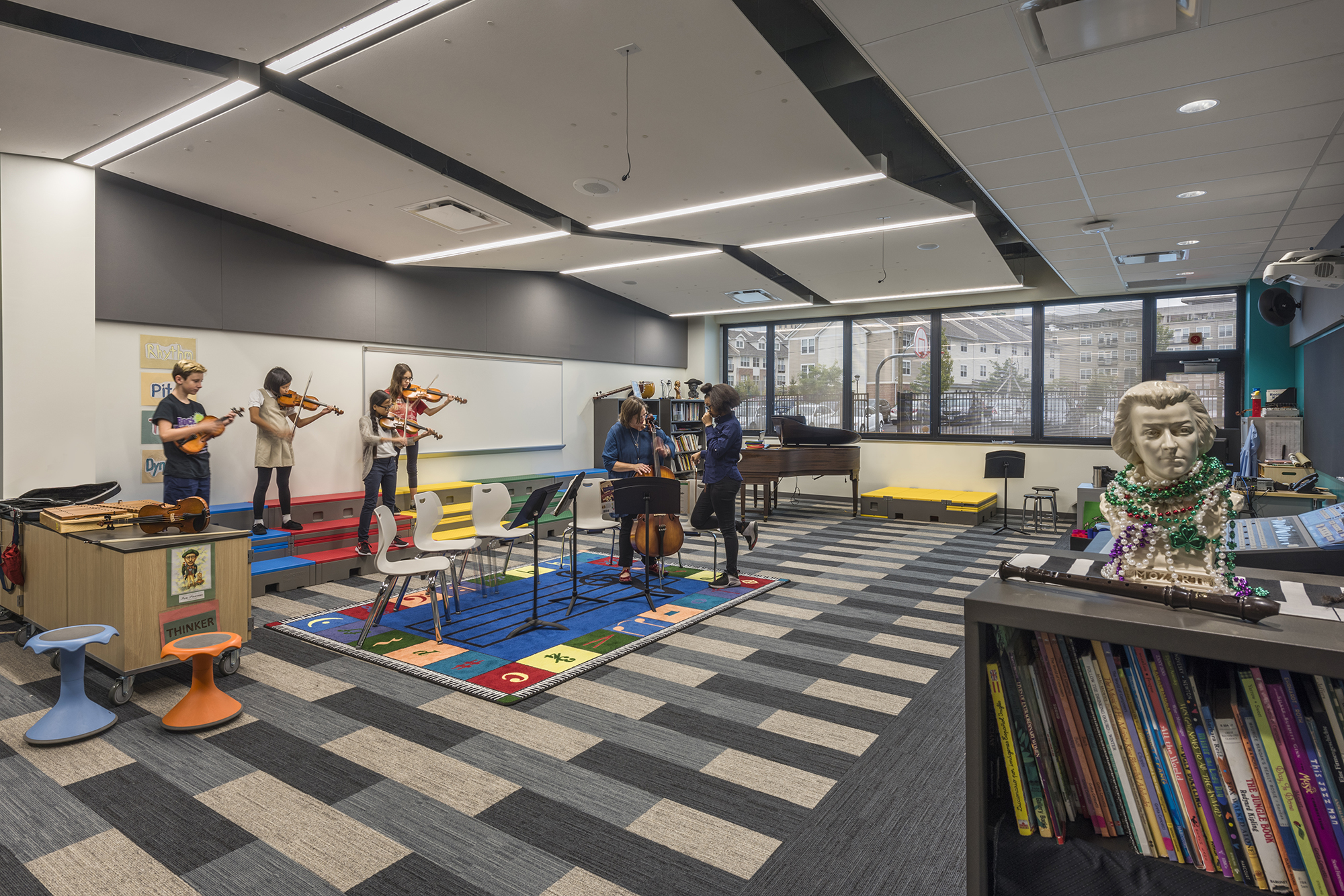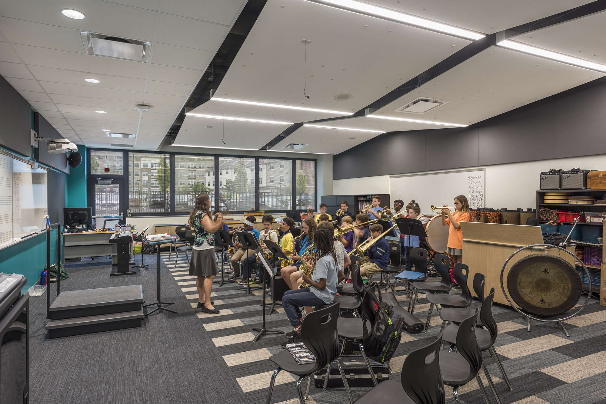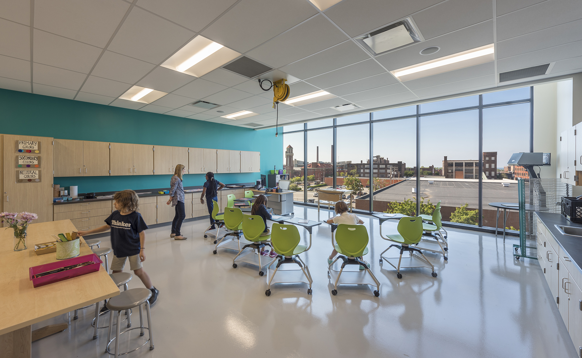 Glass windows from the first floor to the fourth offer visibility throughout the school and the college campus. The idea of everybody seeing everybody, including the visibility between classrooms and down into the first-floor atrium, and everybody’s connection was the most important design element in the building.