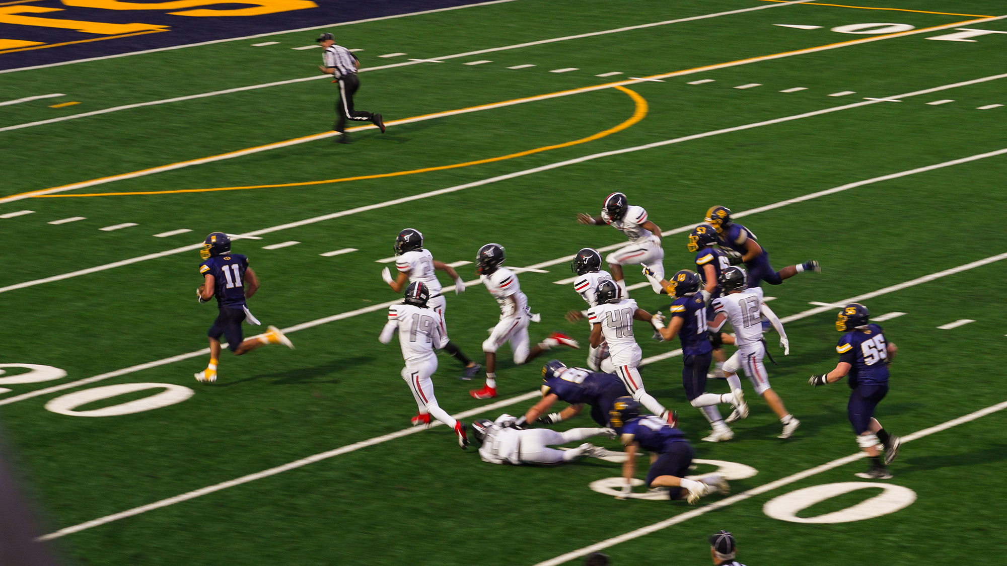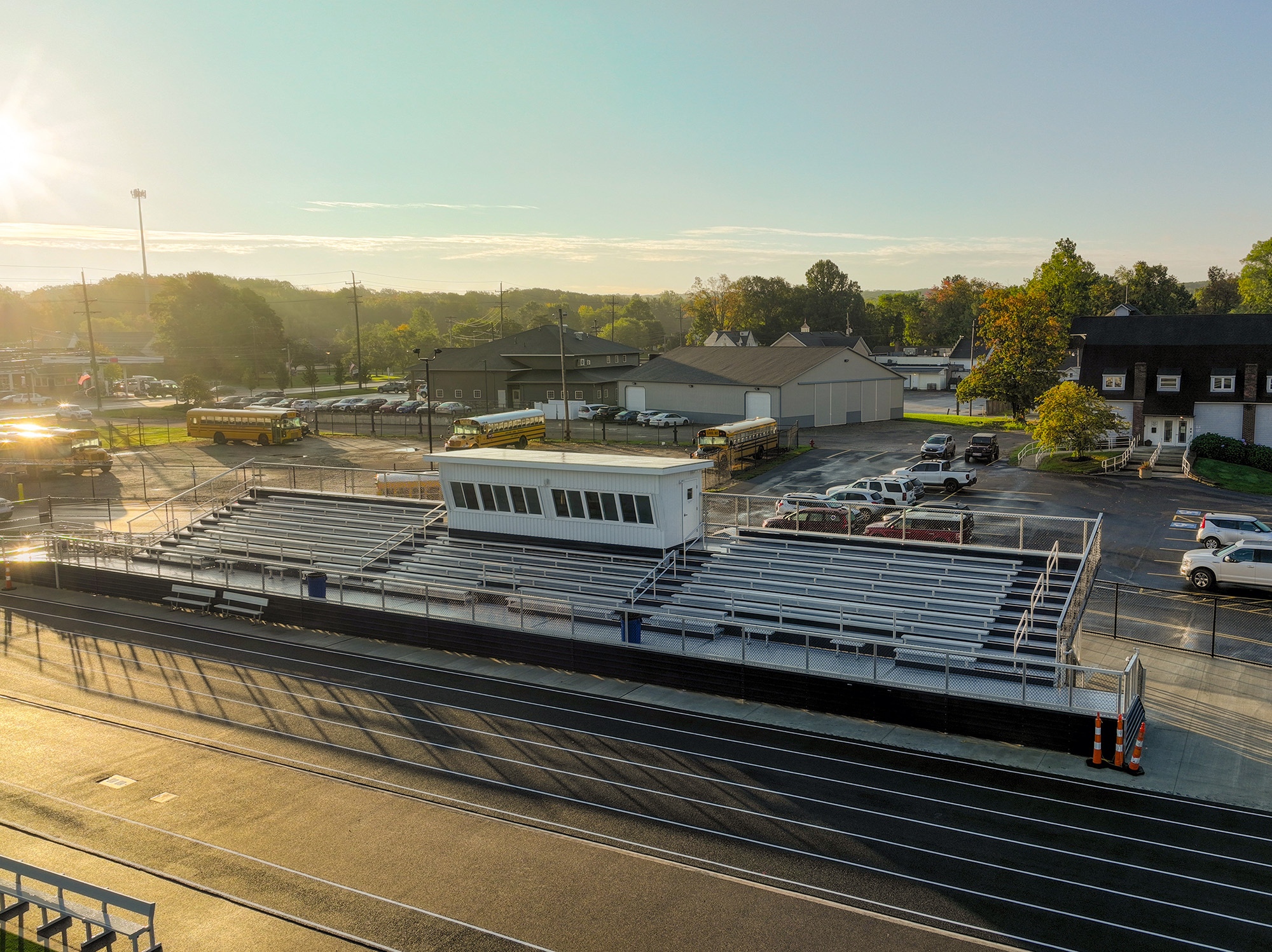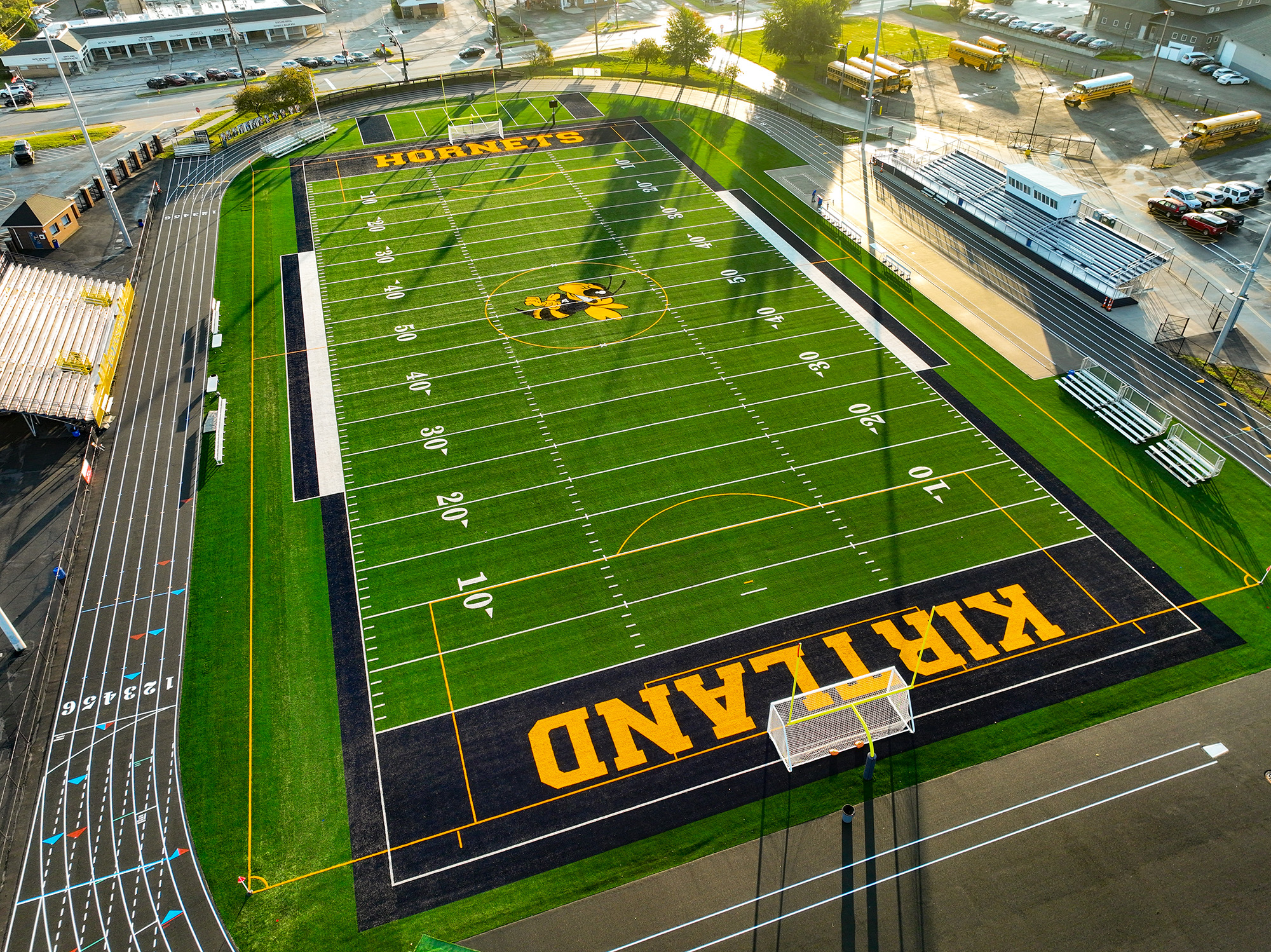 The modern stadium includes a six-lane, quarter-mile polyurethane surface track. Assisted by an improved stormwater management system, the new synthetic track and field no longer experiences extended game schedule delays due to adverse weather conditions.